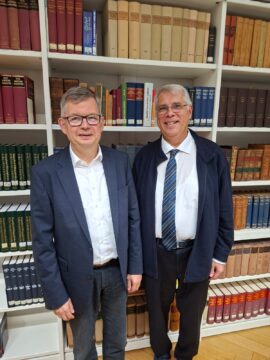 In seiner Dankesrede erinnerte Präsident Dr. h.c. Christian Schad an das 75-jährige Jubiläum des Konfessionskundlichen Instituts, das Christoph Meyns maßgeblich mit vorbereitete und das 2022 in Bensheim begangen wurde. Auch habe, so Schad, während der Zeit von Christoph Meyns der Generationswechsel auf der Ebene der wissenschaftlichen Referentinnen und Referenten des Konfessionskundlichen Instituts stattgefunden: als neuer Catholica-Referent und Leiter des Instituts wurde Pfarrer Dr. Mario Fischer, bisheriger Generalsekretär der Gemeinschaft Evangelischer Kirche in Europa, bestimmt, als neuer Orthodoxie-Referent Pfarrer Dr. Wolfram Langpape, zurzeit noch Oberkirchenrat und Referent für Orthodoxie, allgemeine Ökumene und Stipendien im Kirchenamt der Evangelischen Kirche in Deutschland (EKD) in Hannover. Auch habe sich Meyns angesichts der konfessionskundlichen und ökumenischen Expertise, die er im Bensheimer Institut kennen- und schätzen gelernt habe, auf EKD-Ebene stets für diese Einrichtung stark gemacht.