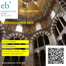 Der Hochschulpreis des Evangelischen Bundes Rheinland wird an eine im Zuge des Studium oder Examens erstellte Haus–, Bachelor– oder Masterarbeit vergeben, die ökumenische, konfessionskundliche Fragestellungen behandelt oder die Stärkung des protestantischen Profils in den Blick nimmt. Ein persönlicher oder inhaltlicher Bezug zum Rheinland wird erwartet.