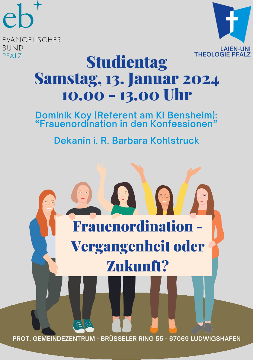 Mit dem Thema „Frauenordination – Vergangenheit oder Zukunft beschäftigt sich ein Studientag des Evangelischen Bundes Pfalz in Kooperation mit der Laien-Uni Theologie Pfalz am Samstag, 13. Januar 2024, 10 Uhr bis 13 Uhr, im Gemeindezentrum Pfingstweide, Brüsseler Ring 55, Ludwigshafen.